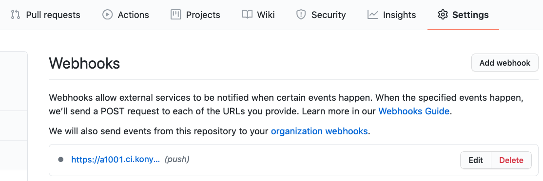 The webhook is created. - You can Edit or Delete a Webhook by clicking the respective button. For more information about Webhooks, refer to the GitHub Webhook Documentation.