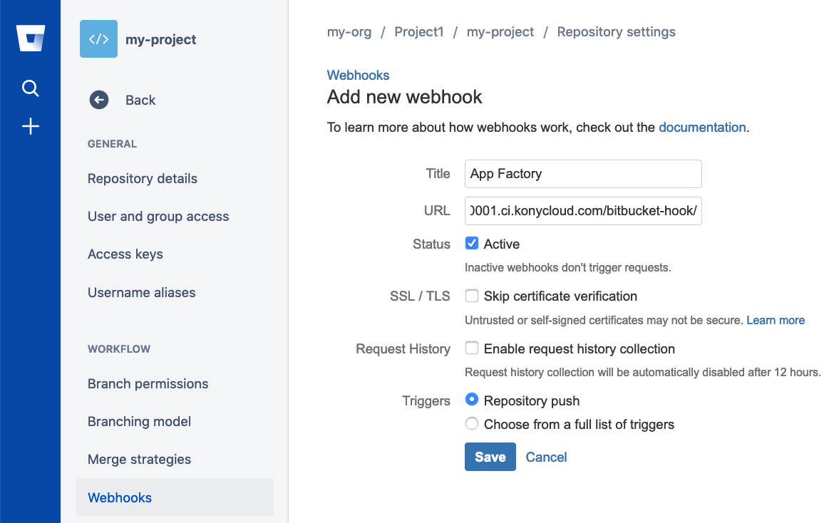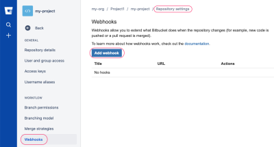 - Open your BitBucket repository in a web browser, navigate to Repository Settings → Webhooks, and then click Add webhook.