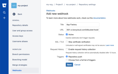 To create a watcher, you must create a Webhook in the SCM that you use for your App Factory projects. For more information about creating Webhooks, refer to the following sections.