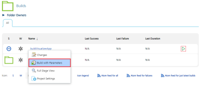 - Open the drop-down list for the buildVisualizerApp job, and then select Build with Parameters.