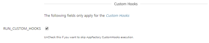 To run Custom Hooks as part of the buildFabricApp job, enable the RUN_CUSTOM_HOOKS build parameter.