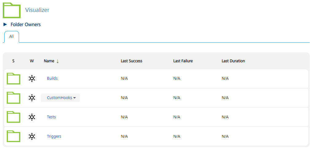 The Custom Hooks Management Console is a dashboard that you can use to manage your Custom Hooks. The console shows Hook Points that specify the stages at which the parent job (buildVisualizerApp) runs the given hooks.