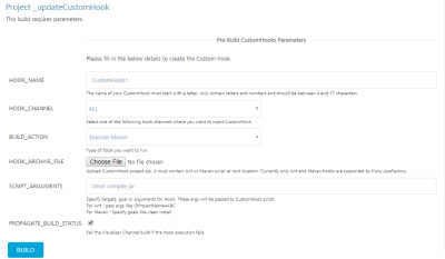 To run Custom Hooks as part of the buildVisualizerApp job, enable the RUN_CUSTOM_HOOKS build parameter.
