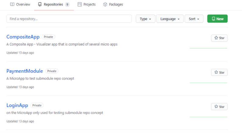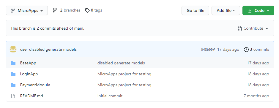 In the Mono Repository approach, you need to version all the Micro Apps along with the Base App in separate folders of the same repository. For an example, refer to the following screenshot about the project structure in GitHub.