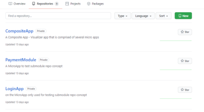 After you create repositories to maintain the micro apps, you can link them to the parent app (base/composite app) repository by adding a submodule. To add a new submodule, you need to use the git submodule add command with the absolute or relevant URL of the project. For example: