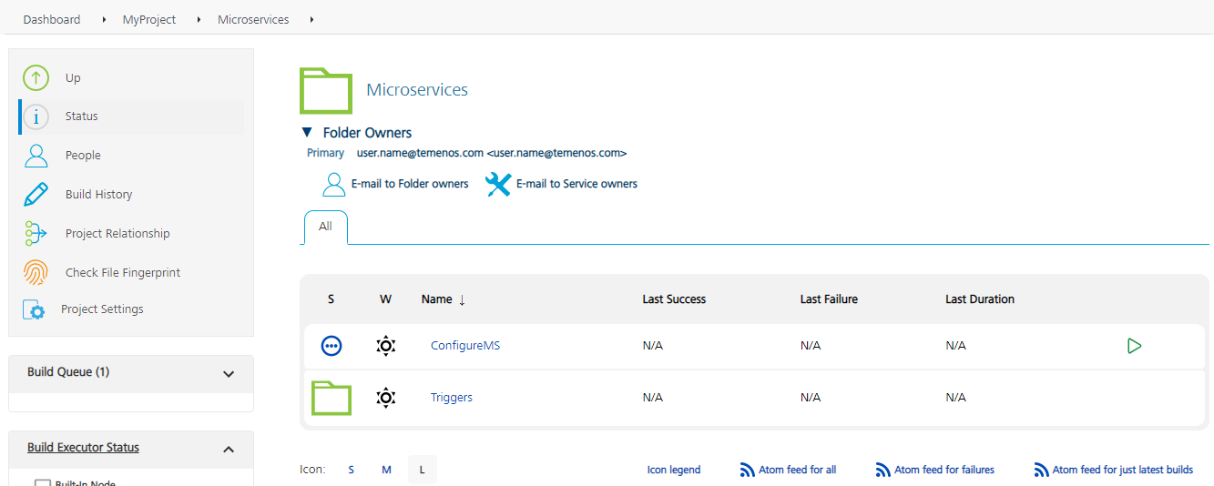 To run jobs for a Microservice, open the project folder from the App Factory console. The Microservices folder in your Project contains the ConfigureMS job and a Triggers folder.