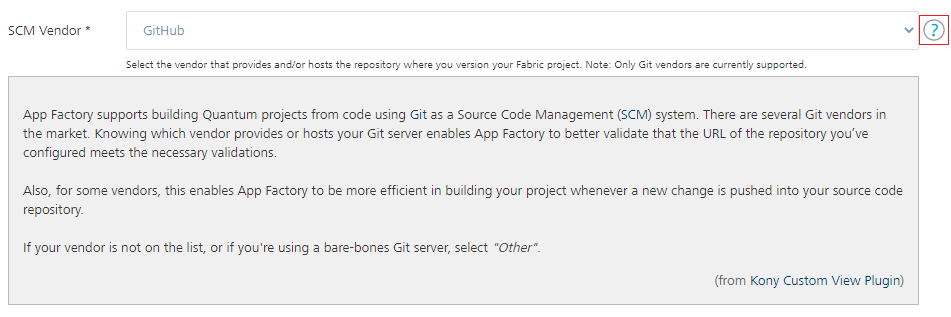 Specifies the Git vendor that hosts your repository. Select the option that matches your Git server. App Factory supports GitHub, Bitbucket, AWS CodeCommit, and JFrog Artifactory. If your Git vendor is not in the list, or if you're using a bare-bones Git server, select Other. IMPORTANT: