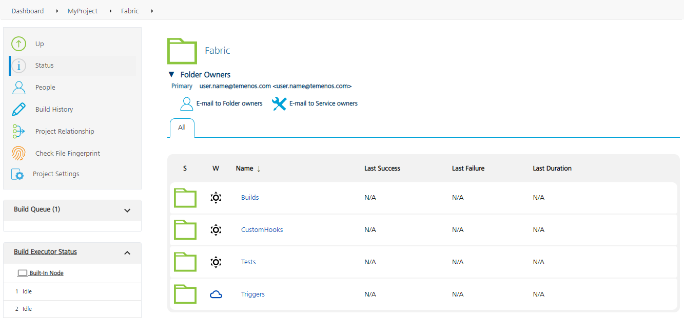 The Triggers folder contains the createFabricAppTrigger job, which creates a trigger to perform a build based on a schedule or based on a push to the source code. There are two sub-folders that store the created triggers based on the trigger mechanism.