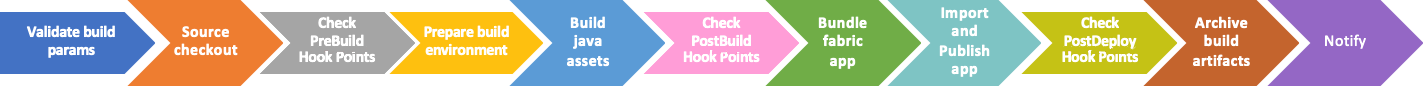 The buildFabricApp job is divided into the following steps that the build pipeline performs during the build process.