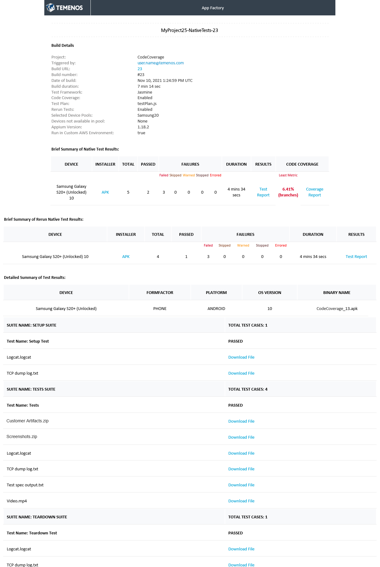 After a build job is completed, members that are added to the Recipients project setting receive an email that contains generic information about the build. The email also contains a list of artifacts with corresponding links to an S3 bucket. The details in the App Factory build notification emails are divided into three sections. Every section contains the following information.