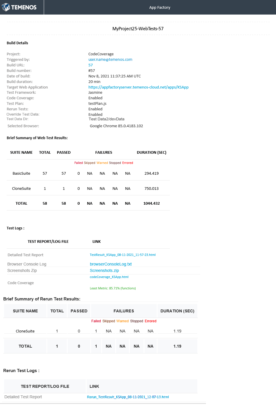 If you enabled rerunning of failed test cases, this section contains a brief summary of the rerun test cases. If you enabled code coverage for your tests, the brief summary contains a Code Coverage Report.