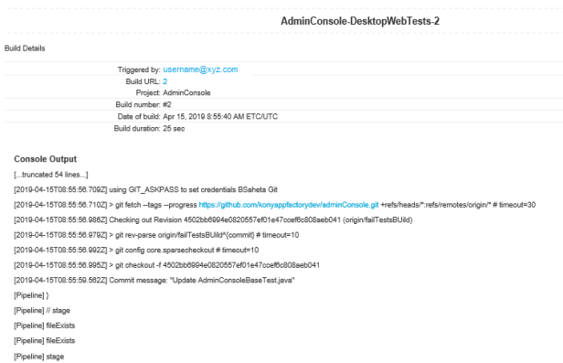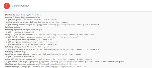 For example, find and click the link for build #4. - From the details page of the failed build, select the Console Output on the left panel. The Console Output Log opens in the right pane.