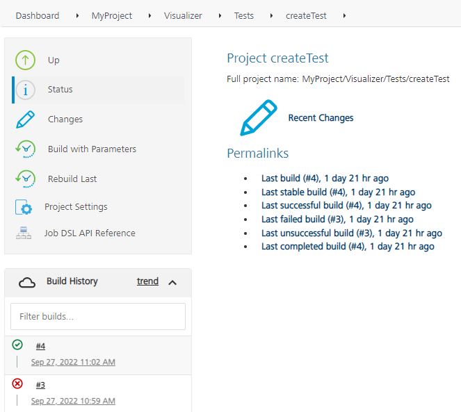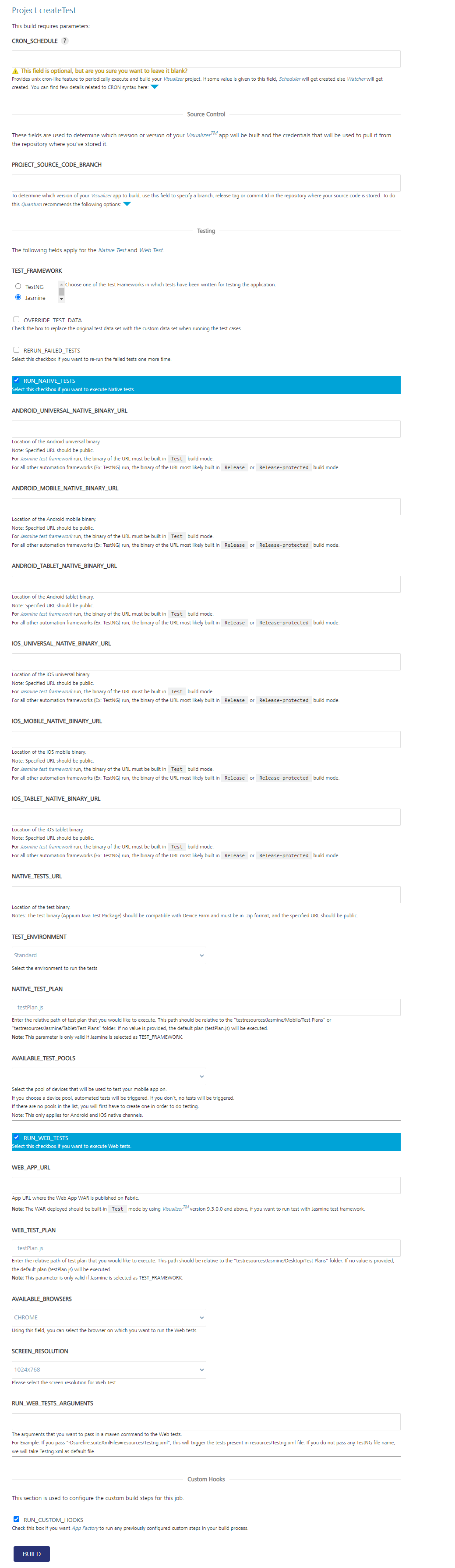 You can trigger the tests from the buildVisualizerApp job available at Project Name > Visualizer > Builds folder. It is the simplest way to validate your code by launching tests right after Building the application. There is no need to specify all parameters as they are provided while running the tests manually. The results can be viewed in line to the Test Results of Manual Tests.