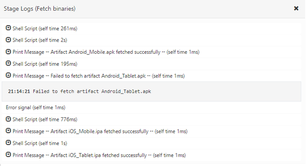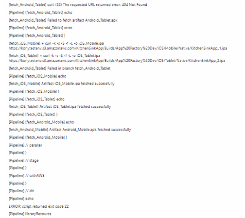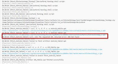 - Scroll to find errors in the log that caused the build to fail. For example, you can trace an error that is related to invalid Android Tablet URL.
