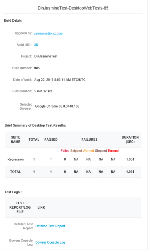 In the final stage, the consolidated test run status is notified via e-mail. Refer the following screenshots for the sample email for consolidated status.