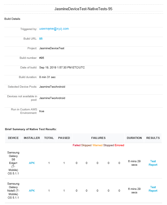 The test results for the rerun are included in a separate section of the notification email. For more information, refer to Build Results Notification.