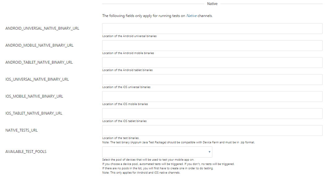 Solution: Make sure that you provide a value to AVAILABLE_TEST_POOLS parameter to run the native tests. - Error: Sorry, You can't run test for Android Universal binary along with Android Mobile/Tablet.