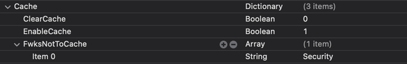 Use the FwksNotToCache key to specify the list of frameworks that must not be part of the cached data. If you do not specify this key in the config.plist file, all the dependent Frameworks are cached by the NFI tool.