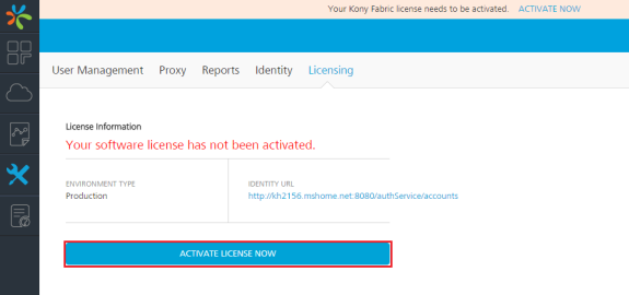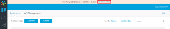NOTE: Kony blocks your Kony Fabric Console if you do not activate the license within 60 days from the day of installation. Initially, Kony creates a default license which is valid for 30 days and provides an additional grace period of 30 days before blocking the console.