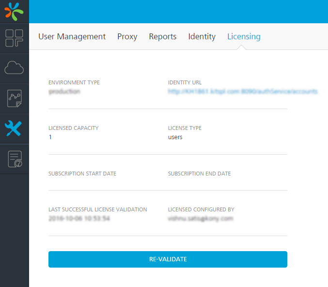 - If the account has a valid license, click on Activate button. The license will be activated and you will be redirected to the Licensing section of your Kony Fabric console. The page displays all the license related information.