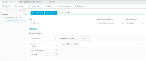 - In the pane that lists integration services and orchestration services, select an integration service or orchestration service, and expand the service. Then drag an operation to the panel under Service Execution Mode.