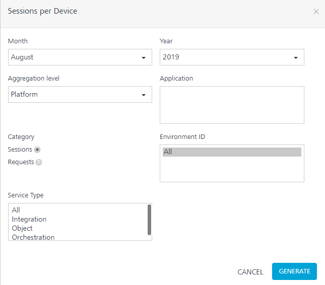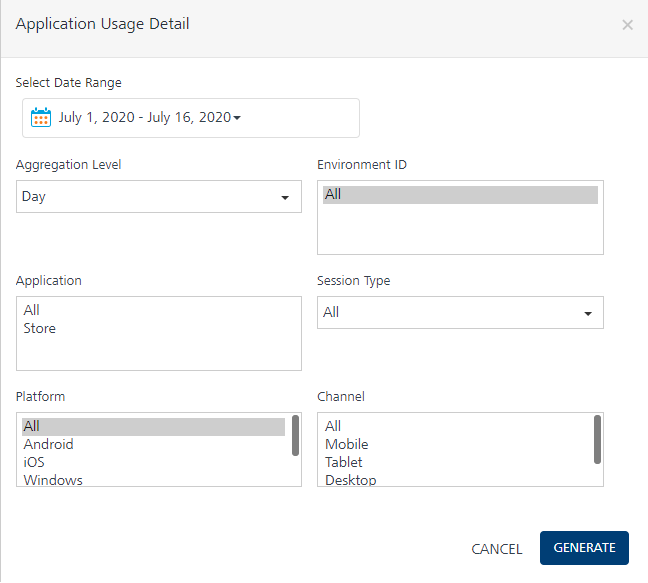 Application Usage Detail report provides information about the usage of an application. It displays the data in the form of sessions per day, sessions per week, or sessions per month in a given date range.