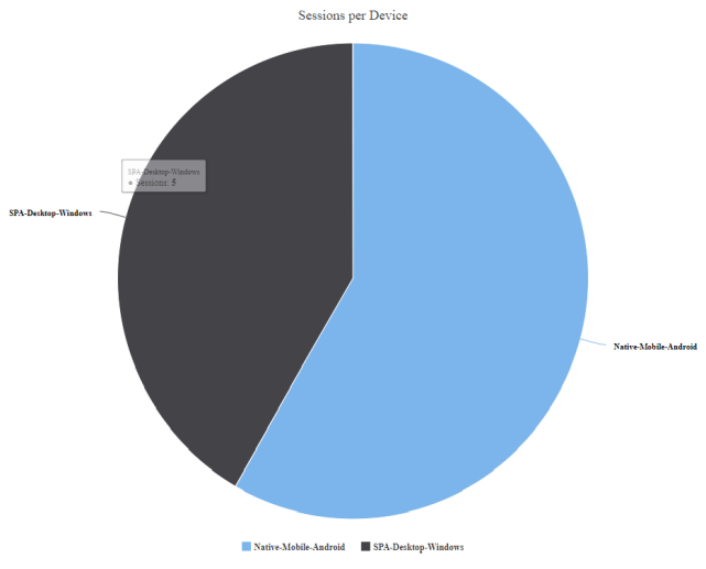 Sessions per Device is a pie chart that represents the application usage breakdown based on channel, application type, and platform.