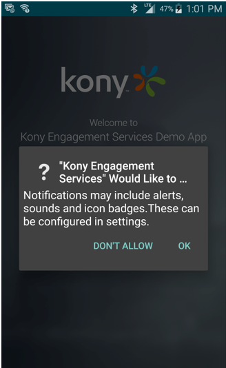 - Click the application icon, on your device, after the installation is complete. This action will display the following screen and request your permission to send push notifications. Click Ok to accept push notifications.
