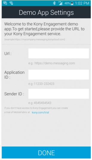 - In the next screen, you will be prompted to enter your provisionedEngagement server URL, application ID and sender ID. Additional details of each of field is given below: