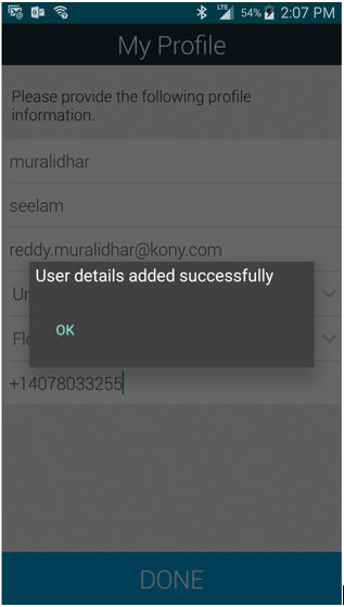 - You will see the following screen once the user has been created successfully. Click Ok and Done again to navigate to the next screen of the application.