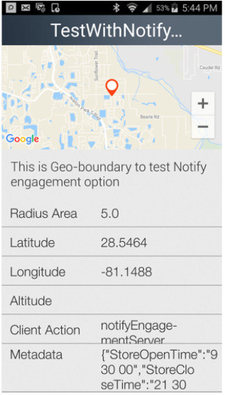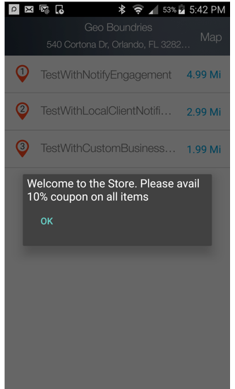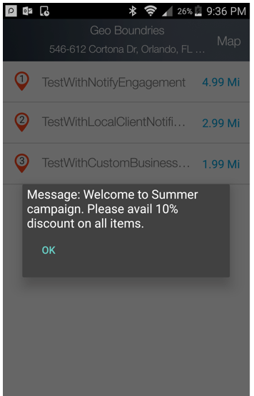 - Once the device/application enters into the TestWithNotifyEngagement geoboundary, the campaign will send a notification to the device as shown below.
