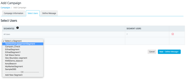 - Select the segment TestNotifyEngagementSegment that was created. Click Next – Define Message to define the message for the campaign.