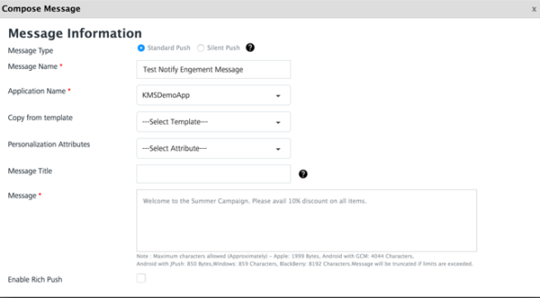 - Select the push message as the message channel. Enter the message name and choose the application name for which the notifications needs to be sent.