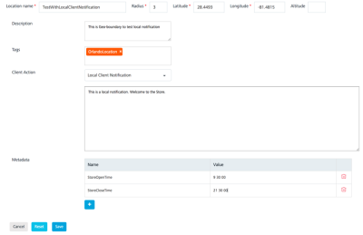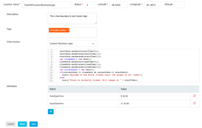 You can just enter an alert or a more complex code as shown below. So when this geoboundary is monitored by a client application, the application can execute this code on the client and display the notification. Enter OrlandoLocation as the tag value. - Click Save to save the geoboundary.