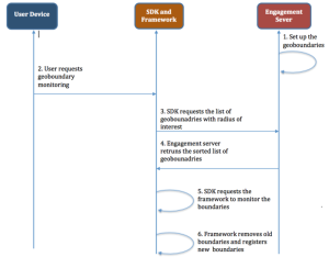 This section discusses the flow and the steps involved in monitoring the geoboundaries that are set up by client applications. At a high level, the geoboundary monitoring will involve using the SDK geo monitoring API. This SDK API in turn invokes the Engagement server API to retrieve the list of the geoboundaries in a radius of interest and then passing them on the framework to monitor. The entire flow of the geoboundary monitoring is explained below.