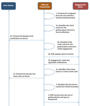 - This step involves the framework communication with the SDK via listeners when the application/device enters or exists a geoboundary and the SDK performs the client action ( executing custom client logic or notification to the Engagement server or sending local notification) of the particular geoboundary. Details of this step are as below: