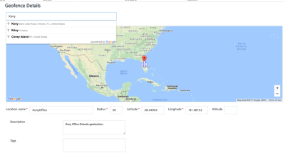 - If you drag and drop the pin, you will have an option of drawing the circle around the pin and this will populate the latitude, longitude and also the radius. This is shown below.