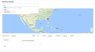 Let us begin with the Notify Engagement Server option. In the screen below, enter the address and pick the address from the drop list down list. In the screen below, the address of Kony in Florida (Orlando Location) is shown as a sample.
