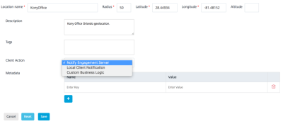 - The second section of the geoboundary creation screen is as below. In the Client Action, there are three options available as shown. The Notify Engagment Server option indicates that the client application needs to update the device location with the Engagement server when the user enters the geoboundary. The Local Client Notification option indicates that the application needs to display a local notification on the device. The Custom Business Logic option indicates that the any custom code set up with this geoboundary will need to be executed on the device.