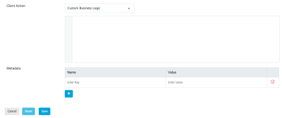 - Choose the Custom Business Logic as the client action. The system displays a text area where the java script that need to be executed on the client application is entered.