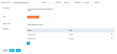 - You need to enter the Location Name, which will be the name of the new geoboundary. The description of the geoboundary will be optional. You can also enter a value for Tags that is additional data that you can associate with a geoboundary. Such data can be used to group a set of geoboundaries. The Engagement APIs, which we will discuss in the later section, also allow you to filter geoboundaries based on the tag values.